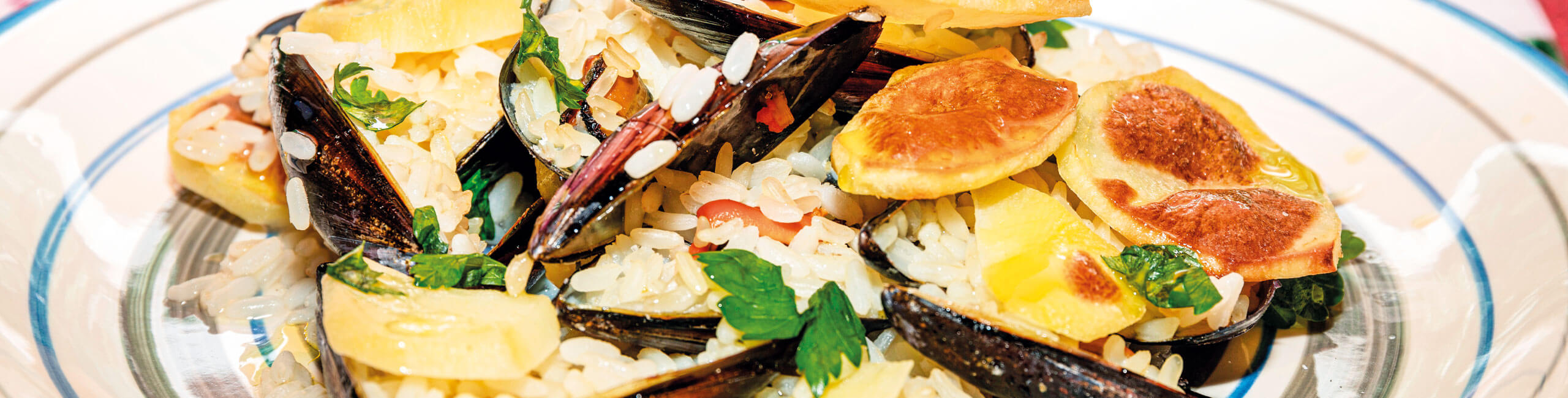 Mussels are one of Puglia's great seafood staples. They're especially prized in Taranto where they're famously cultivated in the placid waters of the Mar Piccolo. Hardcore aficionados might eat them raw but most people cook them and they work brilliantly well with spaghetti, black pepper and parsley. In Taranto, the local speciality is tubettini con le cozze, a delicious mix of mini pasta tubes with mussels and sweet tomatoes. In Bari they like their mussels oven-baked with rice and potatoes, a dish known as riso, patate e cozze.